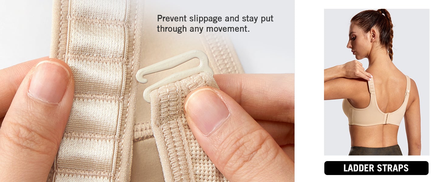 Racerback straps with a four-column, three-row back closure allow effortless adjustment. Double-layered, seamless cups without padding enhance comfort and support. Wide racerback straps provide secure hold, enabling unrestricted movement for confident workouts.